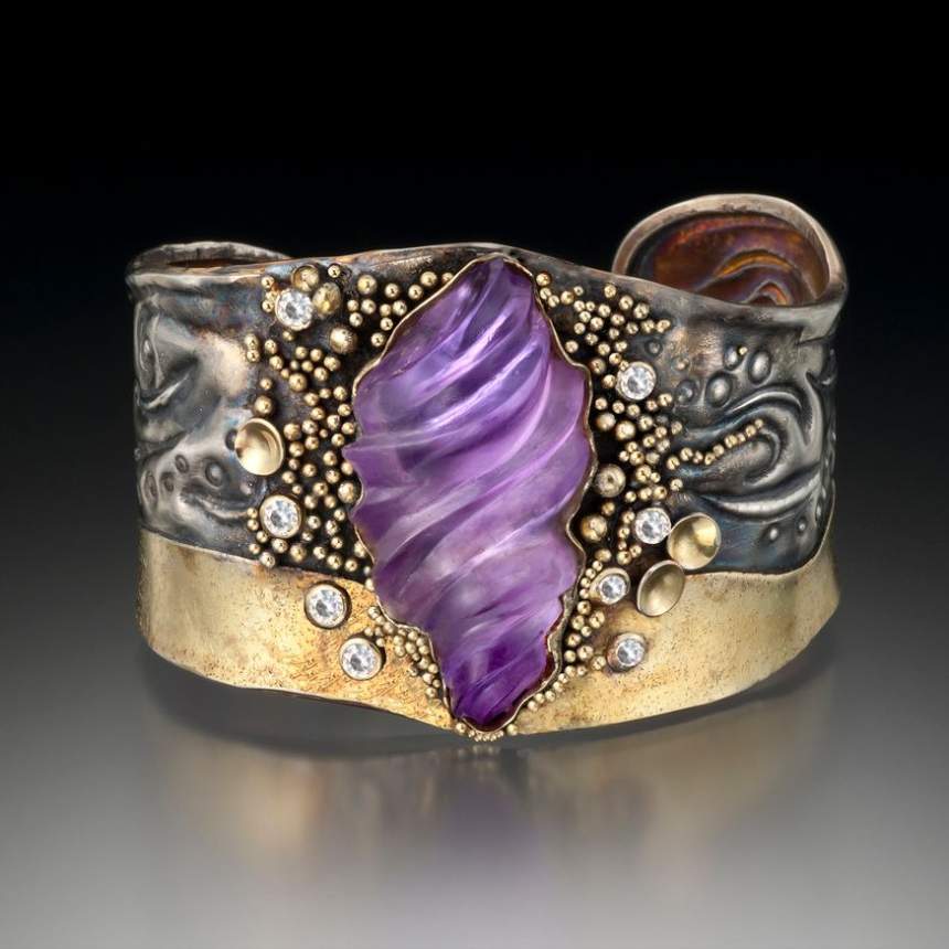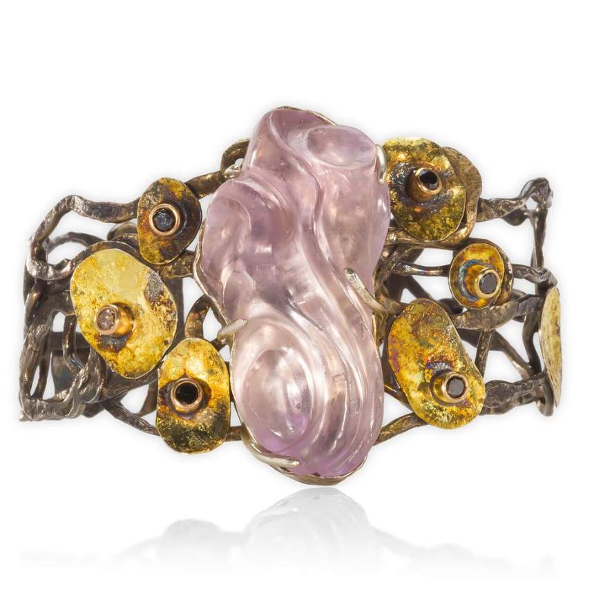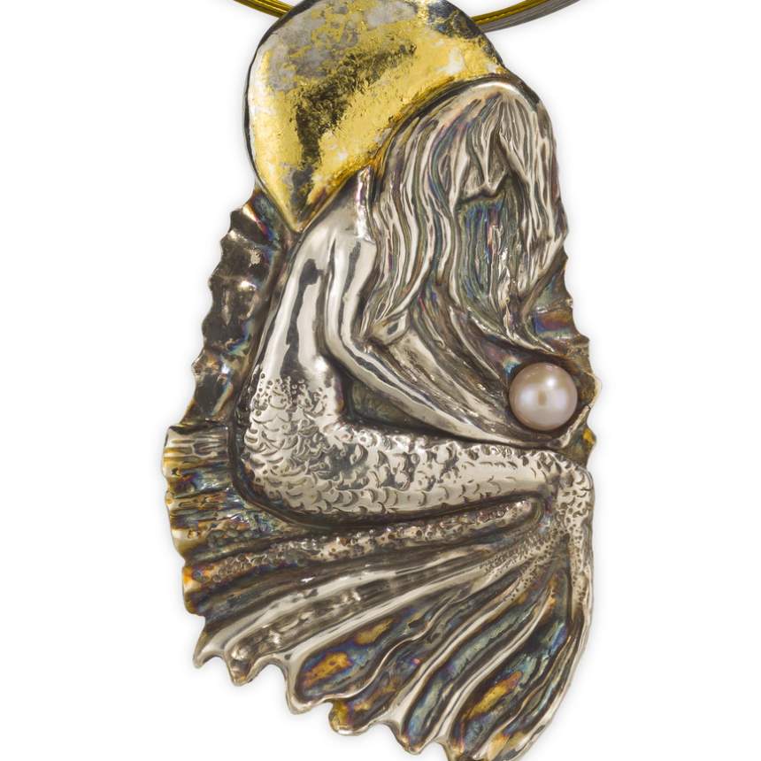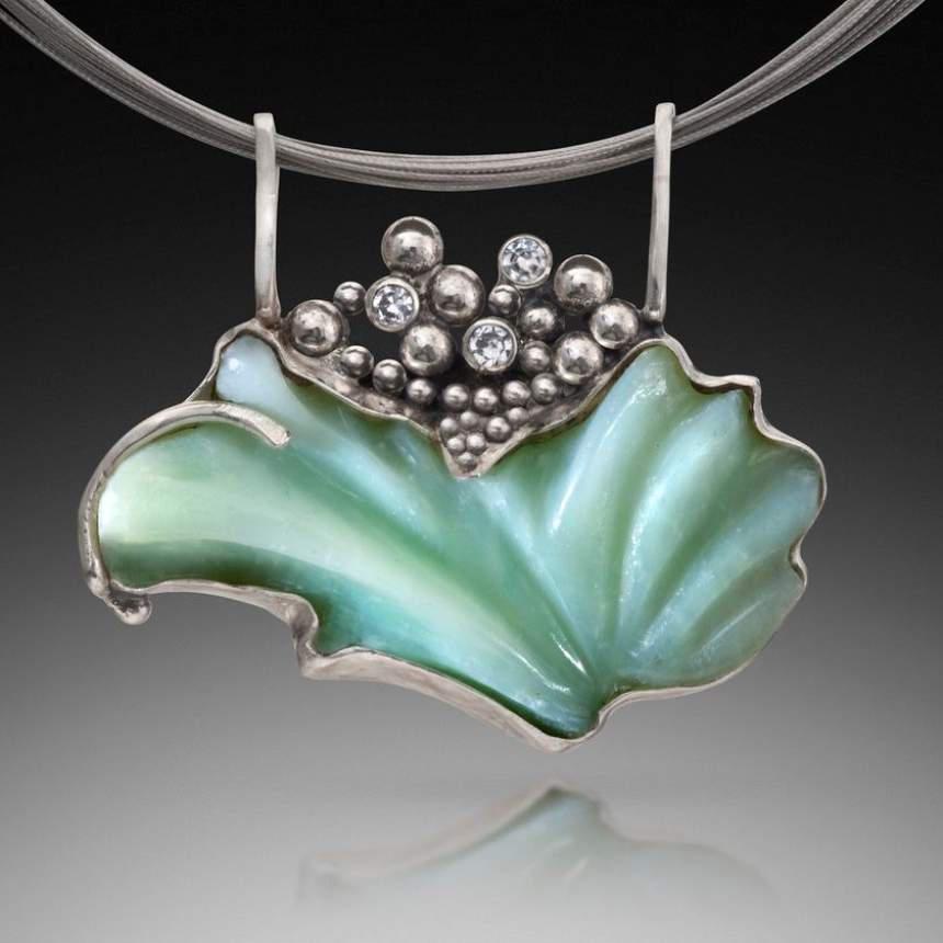 We love to hand-carve our gems (husband and wife) in both the fantasy and organic styles. Our pieces also reflect our love of surface texture. Studies include both the Alchimia Contemporary Jewellery School in Florence, Italy, and the Cleveland Institute of Art. We work primarily in Argentium® sterling silver 935 (which is tarnish-resistant and twice as strong as the old sterling) with accents in 18k and 24k gold. All pieces are hand-fabricated by the artists. Some of the processes we use are: repoussé and chasing, fusing, torch sculpting, reticulation, granulation, fold forming, enameling, keum-bo, and surface texturing. Our jewelry style is contemporary, fluid, and organic. Chains are handmade using various techniques, including handweaving. Trustees of the Cleveland Museum of Art have purchased one of our pieces done in repoussé and chasing. We have collectors who follow us and we have won many awards over the past 20 years.
