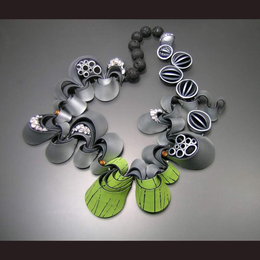 Unique structures and natural objects inspire me to create sculptural jewelry where organic components are set within a contemporary frame. I like to believe that there is something good in everything and that reflects in the concept of hidden or emerging treasures in my work. Polymer clay has been my material of choice. I hand-form polymer clay with no use of commercial molds. All colors are original colors of clay, no paints applied. I use several techniques including caning, engraving, weaving, layering, piercing and many others for which I don’t have name